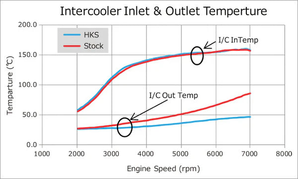 - Massive core upgrade – 100mm-wide HKS core offers ~200% the volume of stock, delivering significantly improved cooling under high boost.