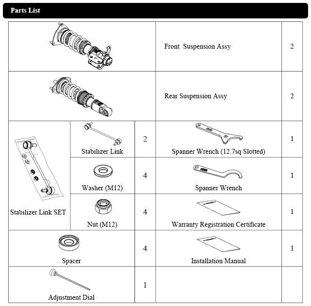 - Front spherical bearing upper mounts for sharper steering response, rear rubber mounts for comfort and stability